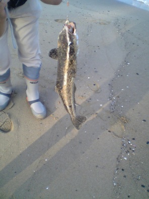 | kisuchikuさんが釣った謎のさかな。後でスギって事が分かりましたが、釣った時には訳が分からず、リリースしてしまいました。 美味しいらしいのに、残念〜! ちなみに、この前に、アカエイも釣っていました(爆) |