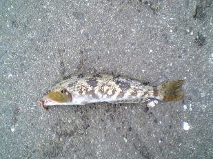 10:30頃、遠投(100m位)していた竿にアタリがあり、上げてみると小さいけれど、一応アイナメ様ゲットなり〜