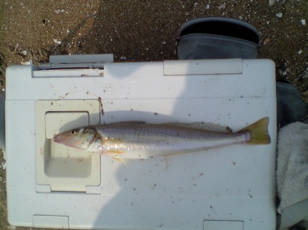 近くに寄ってくると横走りするので、てっきりセイゴかな〜と思ってゆっくり上げてみると何とアオギスでした〜